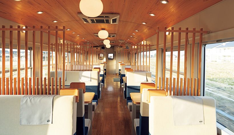 3両編成の3号車の車内。富山県産の「ひみ里山杉」がふんだんに使用されている。1号車にはカウンター席も。
