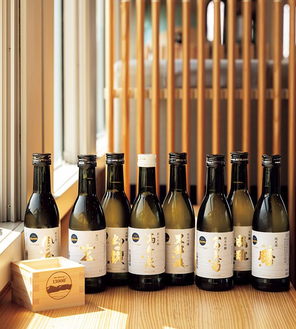 富山の8種の銘酒(1000円~)はオリジナルの1.5合瓶入り。升はセットで500円(単品700円)