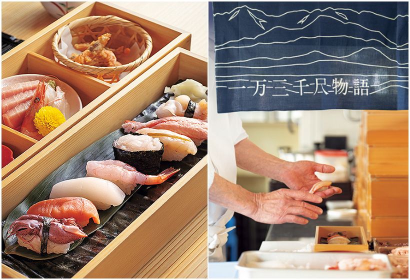 お昼発の1号「富山湾鮨コース」は地魚のにぎり寿司を中心としたメニュー、夕方発の2号「越中懐石コース」では華やかな懐石弁当が供されます。