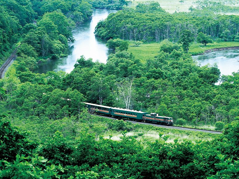 釧路湿原国立公園を走る「くしろ湿原ノロッコ号」。釧路川に沿って蛇行しながら、45分~50分間走行する。一部速度を落として運転することも。