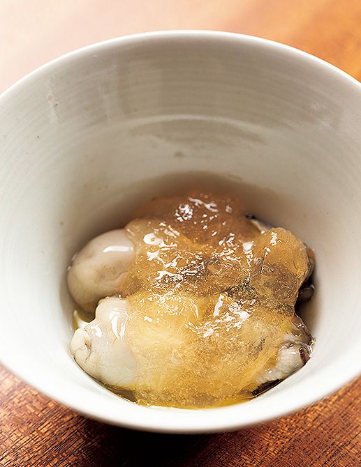 おまかせコースより。江田島産の新鮮なかきは、うまみを生かすためシンプルに土佐酢と柑橘ジュレで。