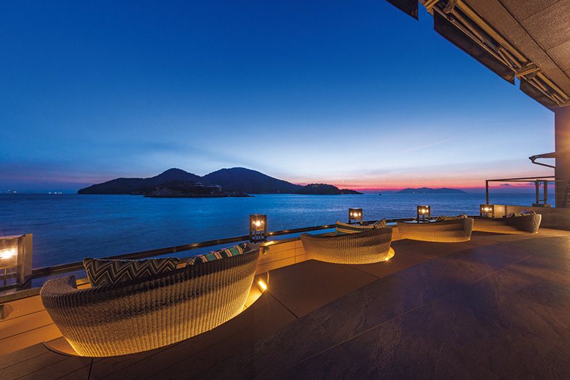 伝説に彩られた仙酔島を眺めるシーサイドテラス。