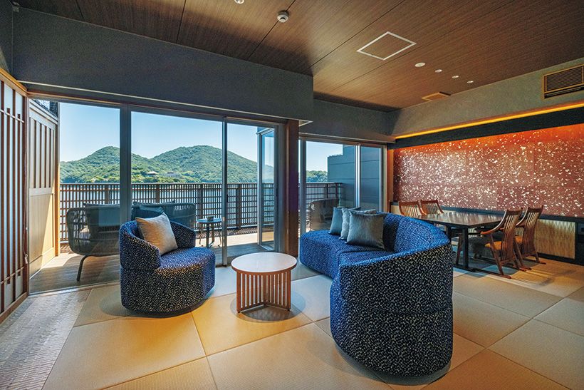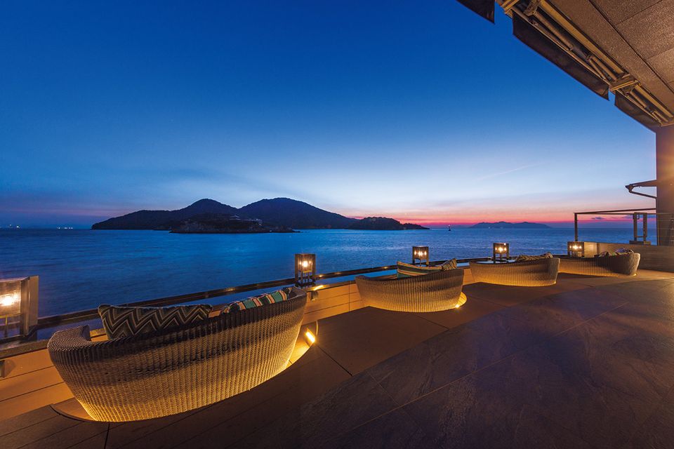 すべての客室から、穏やかな海に浮かぶ弁天島や仙酔島の佳景を間近に見ることができ、まるで瀬戸内ブルーの絶景の中に入るような気分へと誘われます。