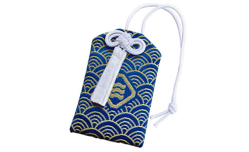 神社の紋である神紋の隅切折敷縮三文字(すみきりおしきちぢみさんもんじ)があしらわれた瀬戸内ブルーが涼やかなお守り。初穂料1000円。