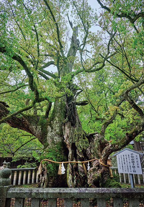 ご神木「乎知命御手植(おちのみことおてうえ)の楠」。境内には約200本の楠の群生があり、「大山祇神社のクスノキ群」として国の天然記念物に指定されている。