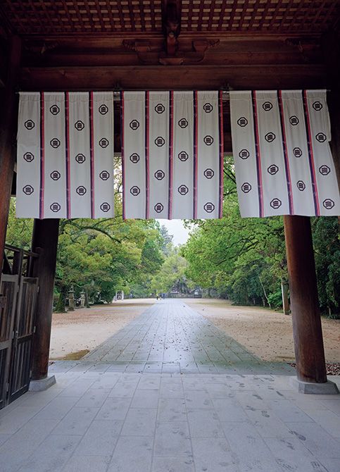 神紋が描かれた門幕がたなびく総門から境内を見る。事業や農業の神様としてもあつく信仰され、地元では「三島明神」「大三島さん」とも呼ばれ、親しまれている。