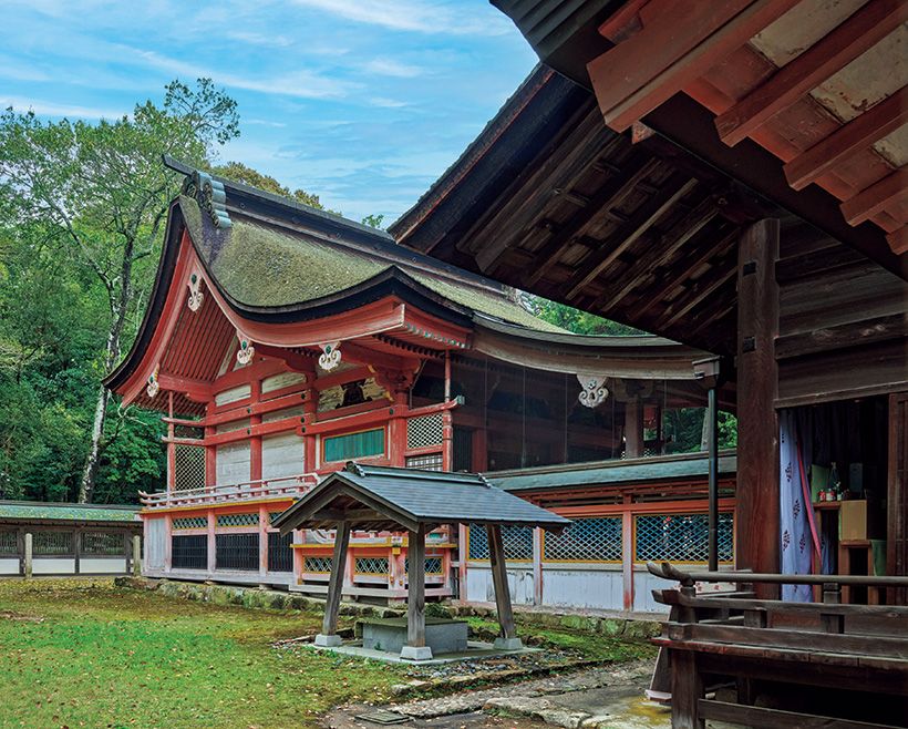 拝殿の奥にある三間社流造(さんげんしゃながれづく)りの本殿。ともに室町時代に再建されたもので、国指定重要文化財。