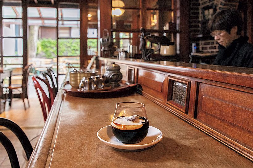 濃厚な水出しコーヒーにリキュールとはちみつを加え、生クリームをおとした名物の「琥珀の女王」や、夏季限定の「マンデリンアイス」(写真下)など、オリジナルのメニューも人気。町歩きの休憩にぜひ訪れたい名店です。