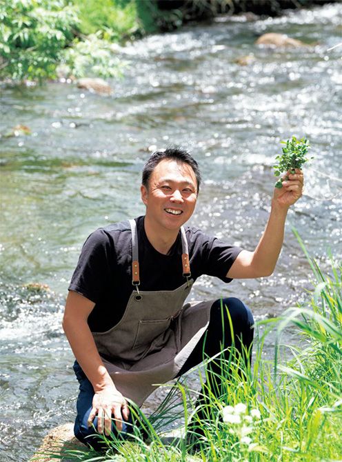 店から一歩出れば、きらめく湯川の流れと風に揺れる山野草、空の広さも申し分なし。「この風景に一目惚れしました。自分の店を開くならと思い描いていた、まさに理想の場所です」とオーナーシェフの近谷雄一さんは目を輝かせます。