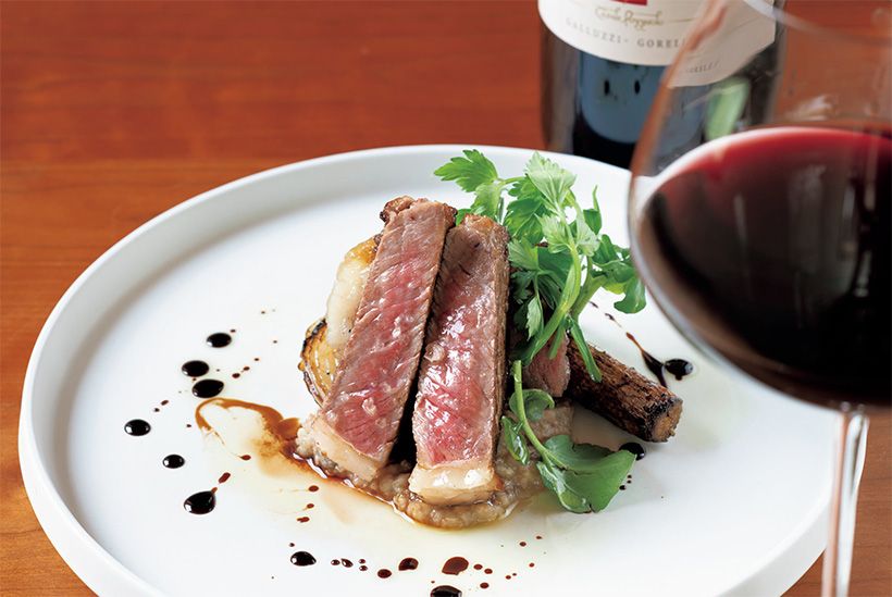 岩手の短角牛のリブロースを炭火でグリルした「短角牛のビステッカ」。白いんげん豆と雑穀のラグーを添えて。