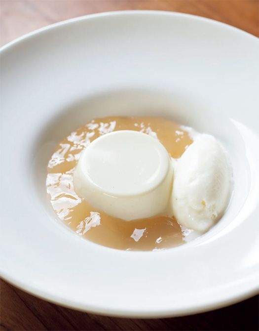 デザートのパンナコッタには、庭で育てている黒文字を使用。佐久穂の農園の紅玉りんごのジェラートとジュレとともに。
