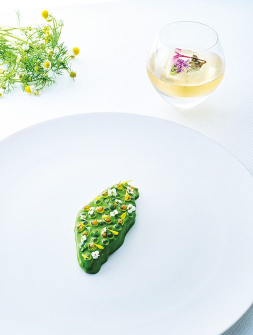 クレソンのピュレを纏った「ますのミキュイ」にはエルダーフラワーとカモミール、白ぶどうのモクテルを。