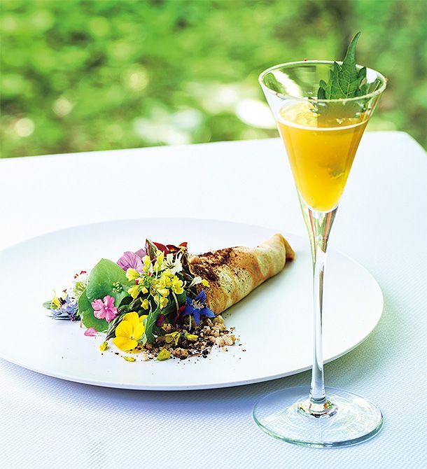 10種を超える野菜をライ麦のクレープで包んだ、ブーケ仕立ての一品。ほおずき果汁を自家製のハーブビネガーやトニックウォーターで割った一杯と。