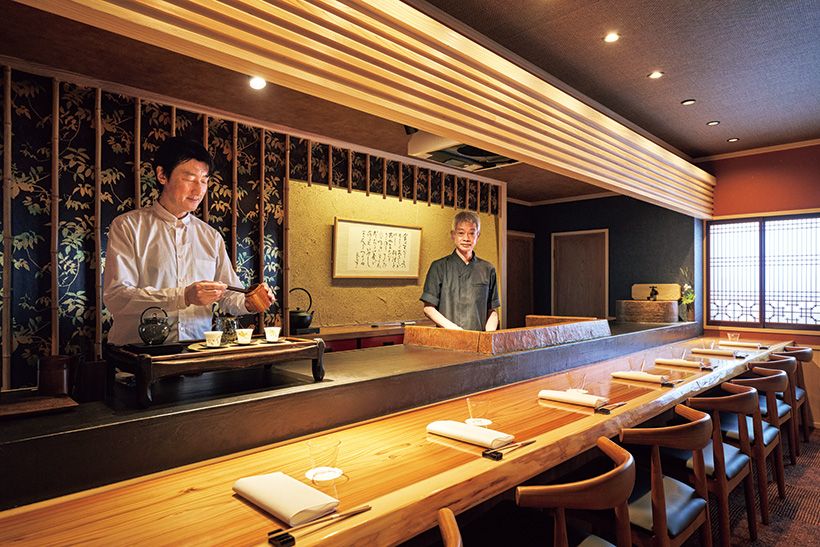 鴨料理に合わせて厳選した国産茶もおすすめ。手前はプロデューサーを務める菊池博文さん、奥は料理長の湯澤広幸さん。