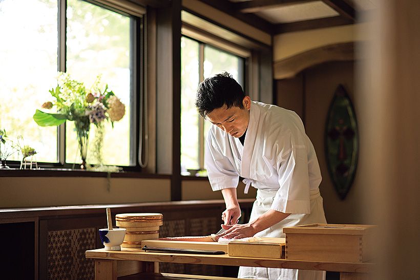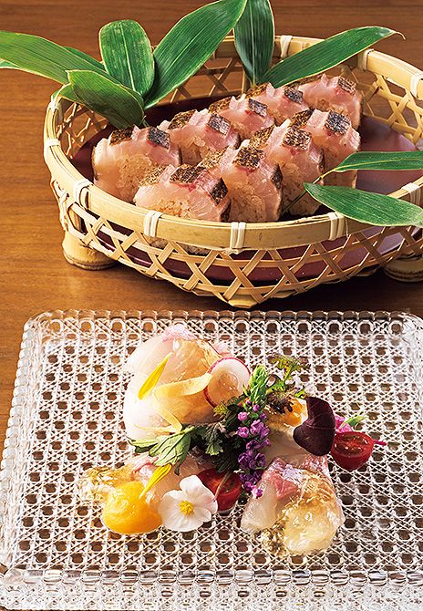 「長野県の食材をテーマにした献立などもご提案しています。たとえば “信州大王イワナ” ならば、お造りやお椀、棒寿司などで幅広く。素材や料理法をお話しすることも多いですね」と統括料理長・福本啓太さん。