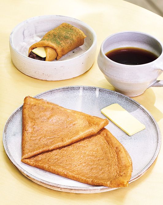 クレープカフェ「Hygge by ØC」。手前から「シュガーバタークレープ」1300円、テイクアウト限定の「あずきバターミニクレープ」660円。撮影/西山 航