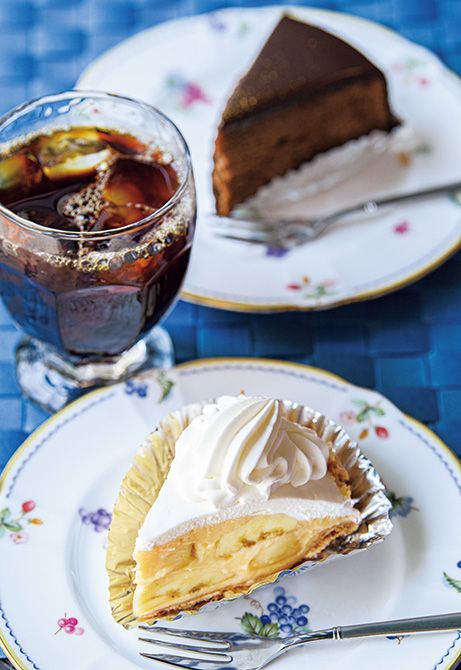 「もみの木 軽井沢」のケーキ。手前から「バナナパイ」500円と「ザッハ・トルテ」550円。撮影/鍋島徳恭
