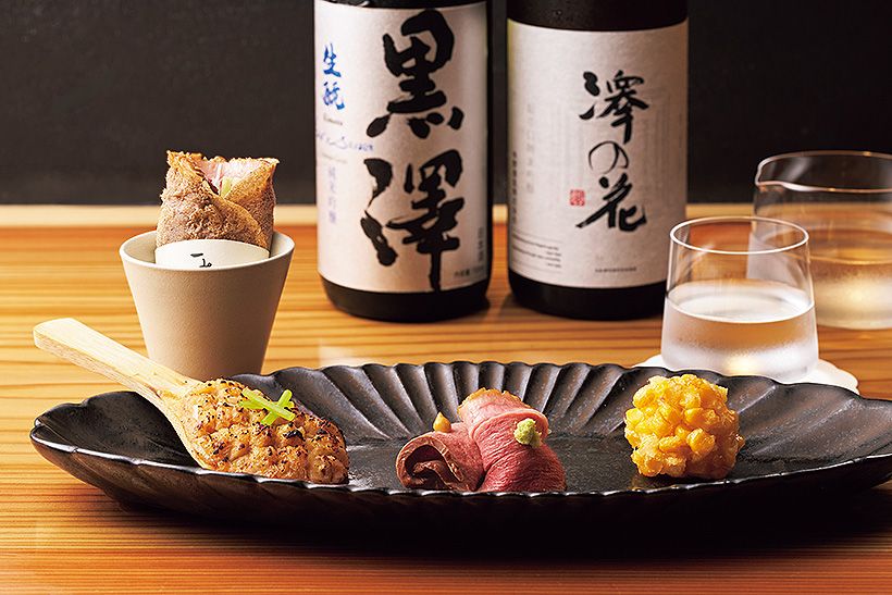 「一茶庵 KARUIZAWA」の前菜。そば味噌、鴨ロース、とうもろこしのかき揚げの「3種盛り」1000円。「軽井沢ダック」700円。撮影/西山 航