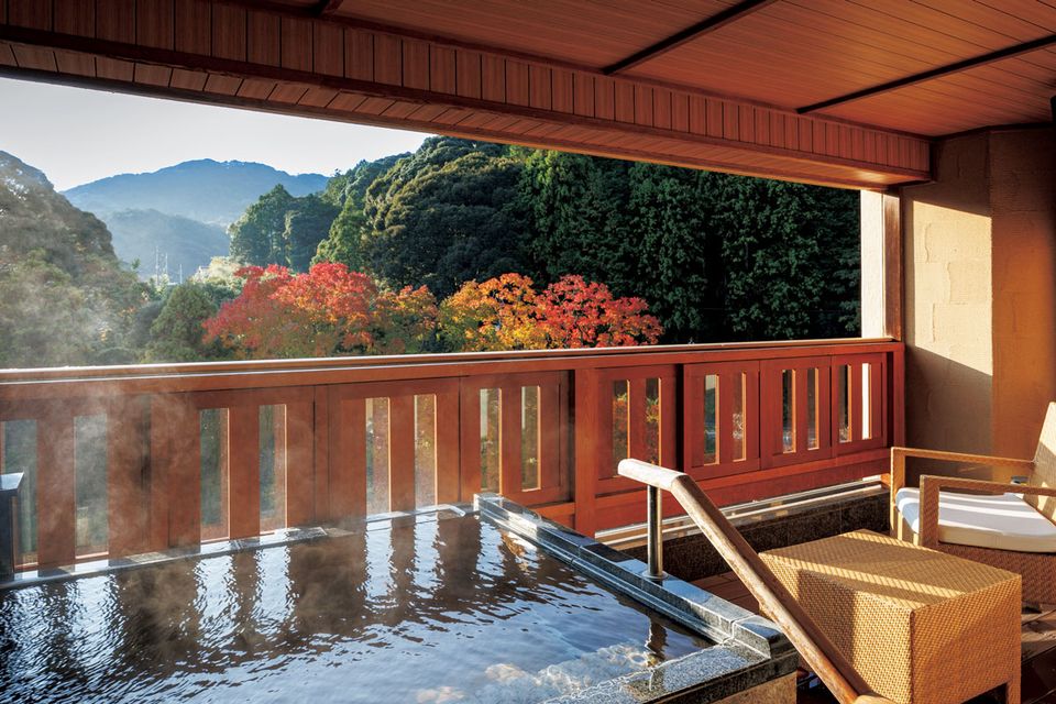 渓流側にある人気の「芙蓉ジュニアスイート」。テラスに設えられた露天風呂からは、美しい山々や紅葉のパノラマが目前に広がる。