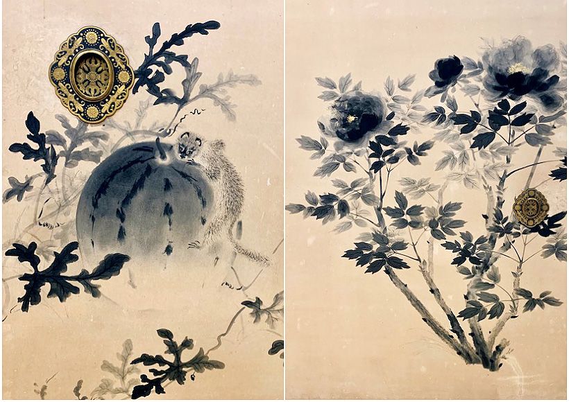 左は「瓜の間」。スイカとたわむれるイタチを描写。右は「牡丹の間」。水墨画の技法を駆使して紅白の牡丹が描き分けられている。引手も堂本印象のデザイン。
