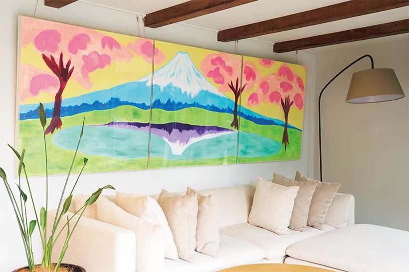 スイートヴィラのアーティストコラボレーションROOMには、大宮エリーさんによる富士山の絵も。富士山が見えない日も、そのエネルギーを感じられるような作品。