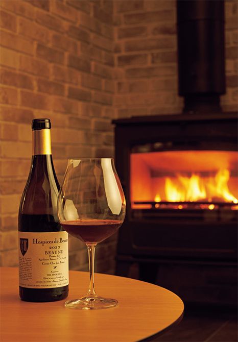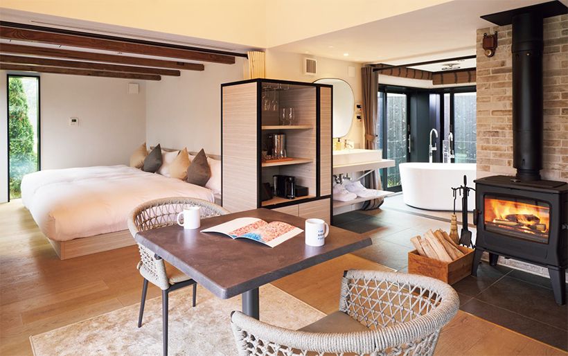 ヴィラには暖炉が備えられ、薪をくべる体験も楽しみの一つ。ゆらめく炎を眺めながら、選りすぐりのラインナップが揃った極上のワインも味わえます。部屋の内風呂も天然温泉のため、外に出ることなく、絶景、美食、ワイン、温泉のすべてが堪能できるのも、プライベートヴィラの魅力です。