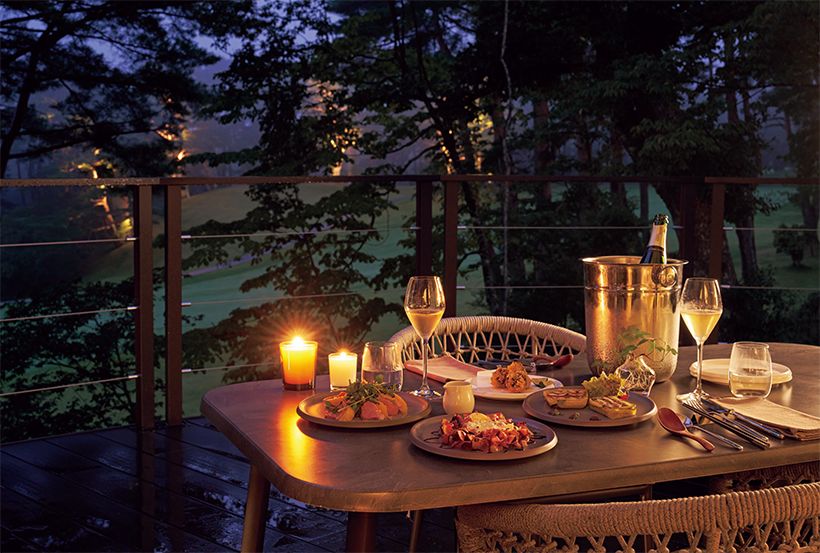 食事はヴィラのテラスで、スタッフが目の前で調理しサーブしてくれる贅沢なバーベキューを。星空の下、富士山のシルエットを前にキャンドルの灯りの中で味わうディナー、朝日に照らされた富士山を眺めながら楽しむ朝食──、さまざまな表情の富士山に抱かれていただく食事は格別です。