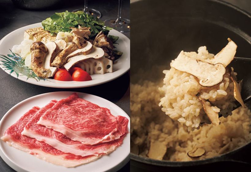 さまざまな松茸料理が味わえる「山ごはん 松茸鍋コース」(季節の一例)より。右・テラスで土鍋で炊き上げた松茸ごはん。湯気まで美味。左・松茸と黒毛和牛サーロインのすき焼き。山梨産の野菜とともにいただく。食事だけを楽しむことも可(要貸し切り代)。