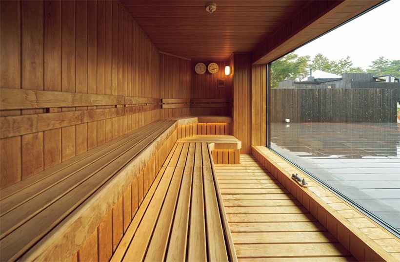 温浴棟には最新のロウリュウ式サウナも。サウナからも雄大な富士山を眺めることができる。