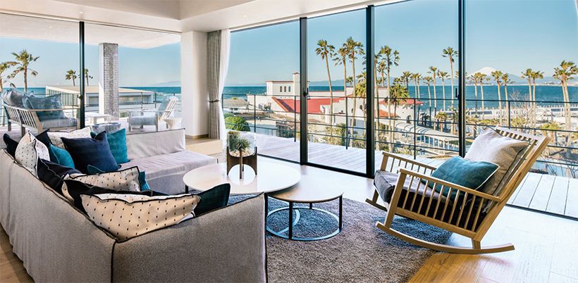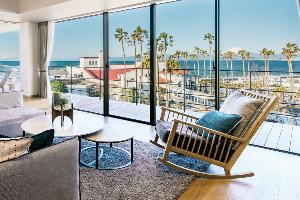 全11室の客室はすべてスイート仕様。なかでも最上級の「マリブスイート」は、93平方メートルの客室と51平方メートルのバルコニーを備え、ヤシ並木の向こうに美しいハーバー、そして富士山を望める贅沢な空間です。