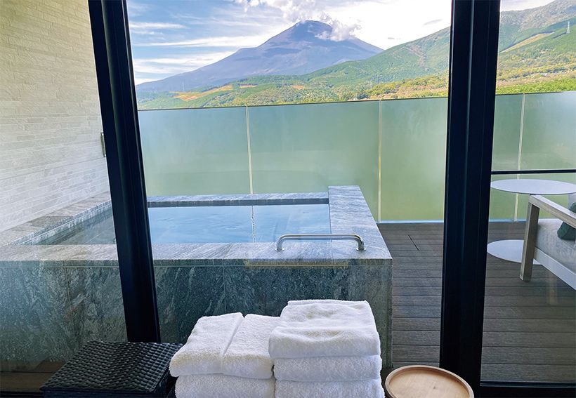 露天風呂は富士山ビュー。ホテルには硫酸塩泉の自家源泉温泉にゆっくり浸かれる大浴場もあり、そちらも富士山が目の前だ。