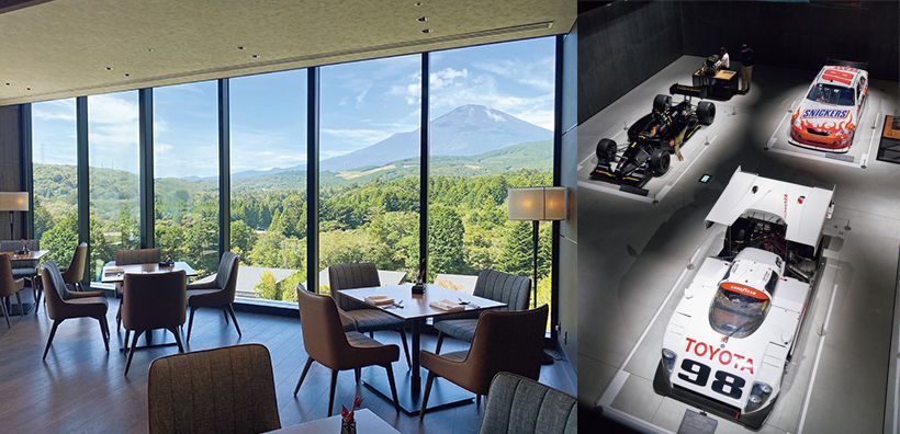 右・ホテル内には世界のレーシングカー約40台が展示されているミュージアムがあり、モータースポーツの歴史が辿れる。左・「TROFEO イタリアン」は個室が3つあり、写真のエメラルドルームは定員24名。富士山を眺めながら少人数のパーティを楽しむことも可能。 あるときはトヨタ自動車のマスタードライバーとして、またあるときはレーシングチーム「ルーキーレーシング」の代表として、富士スピードウェイを訪れる豊田会長。そうした折に利用するホテルの専用ルームを、今回特別に見せていただきました。