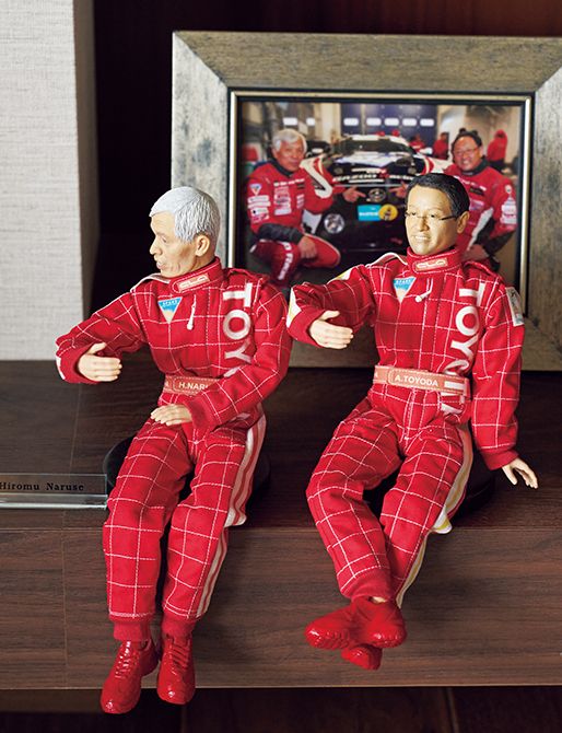 人形のモデルは豊田会長(右)と、会長が師と仰いだマスターテストドライバーの故・成瀬 弘(ひろむ)さん。