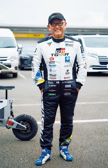 レーシングスーツがよく似合う豊田会長。サーキット場で6台の車を試乗し、開発チームとの話し合いを終えると、ごきげんな笑顔を見せた。