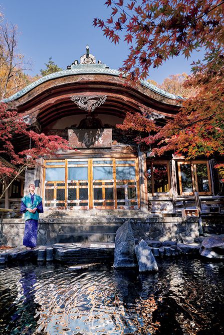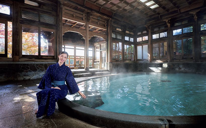 長野・湯田中温泉の「よろづや」にある宮大工が建てた伽藍建築の「桃山風呂」。pH8.2という弱アルカリ性の豊富な自家源泉は、肌をなめらかにするため、美人の湯と呼ばれる。