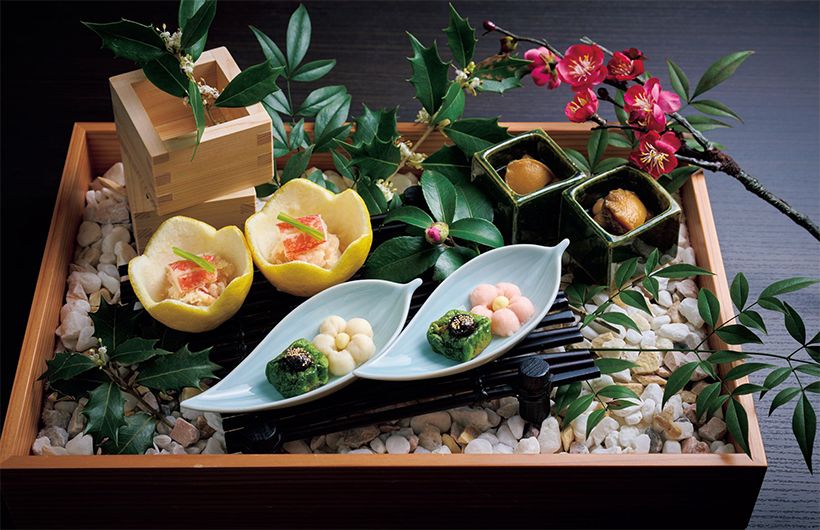 料理は毎月メニューが変わり、滞在中は料理長・井上邦彦さんが客前で調理を仕上げる演出も。2月の庭のイメージを表した前菜。かにのみぞれあえ、あわびの大船煮、よもぎ麩の田楽、ゆり根ずしが盛りつけられている。