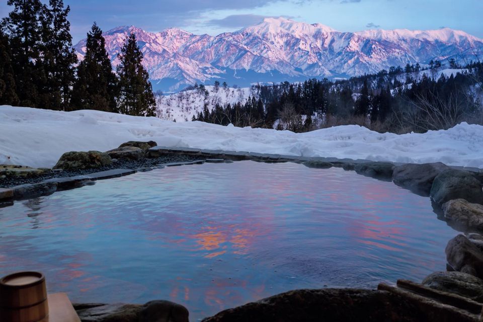 四季の移ろいを満喫できる湯処「天の川」は、自然との一体感を感じられるよう開放的な設計に。日本百名山である巻機山(まきはたやま)をはじめ、標高2000メートル前後の山々が連なる絶景を背景に、贅沢なひとときを過ごせます。