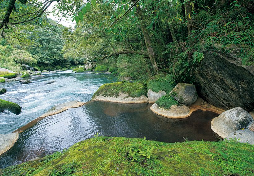 天降川に面した野天風呂「椋の木」。湯船の中から源泉が湧いており、炭酸の粒が肌の上ではじける。