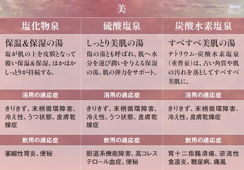 硫酸塩泉、塩化物泉でしっとり潤いの美肌に「炭酸水素ナトリウム(重曹)を多く含む炭酸水素塩泉は、皮脂を洗い流し、古い角質を取り除いてくれます。硫酸塩泉と塩化物泉はいずれも塩が皮膚を覆うので保湿・保温効果が非常に高く、血流が改善されます」(早坂さん)