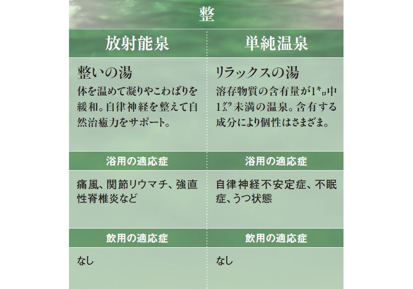 自律神経を整える単純温泉でリラックス。放射能泉はホルモンバランスも調整。「含有成分が一定値未満の単純温泉は、湯あたりしにくく子どもから高齢者まで安心して入れる優しい温泉。ですが温熱効果は十分です。放射能泉は尿酸の排出量が増し、唯一、痛風の適応症が認められています」(早坂さん)