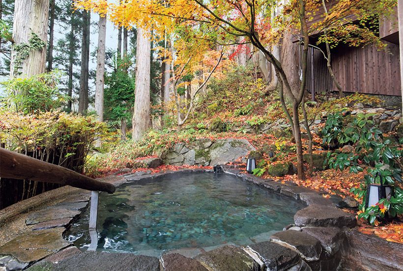 大浴場でも露天風呂を堪能できる。季節の移ろいを感じる木々に囲まれて大自然に没入する湯浴みを。
