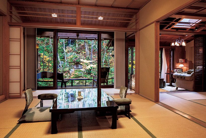 仙山亭の客室「仙丹」。和室と洋室を融合した部屋には、風情ある庭をゆっくり眺められるテラス付き。