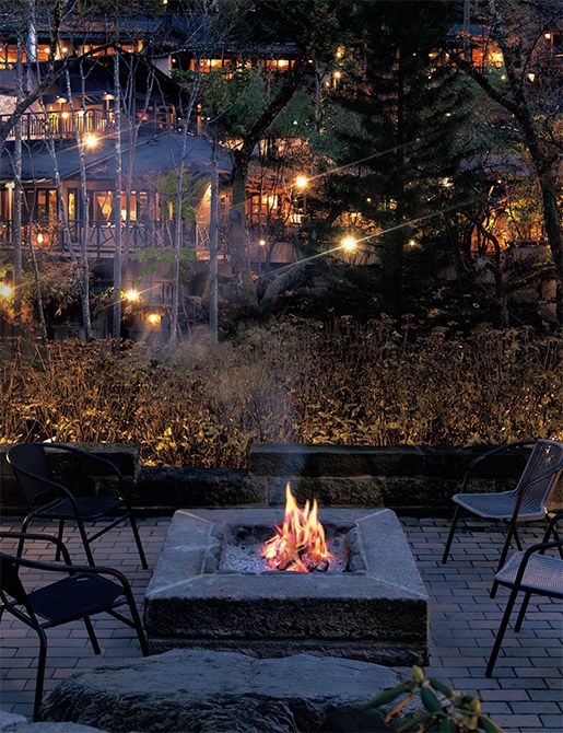 山里の小さな村を思わせる敷地内には、囲炉裏スペースも。星空の下、宿に灯る明かりとゆらめく火を眺めながら癒やしの時間を過ごせる。