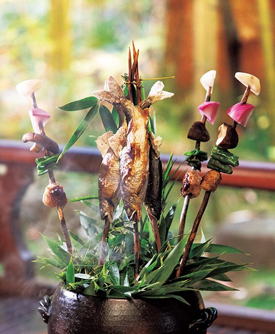 千曲川で育った川魚をりんごの枝に挿して焼いた「子持ち鮎の白焼き」。見た目から楽しく、自然と会話も弾む。メニューは時季によって異なる。