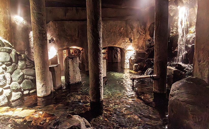 山岳仏教の修験道が栄えた地で平安時代末期に発見され、多くの山伏や武士を癒やしてきた仙仁温泉。毎分275リットルもの湯が自然湧出する洞窟風呂や、5つの貸切風呂でその恩恵を受けることができるのが「岩の湯」です。