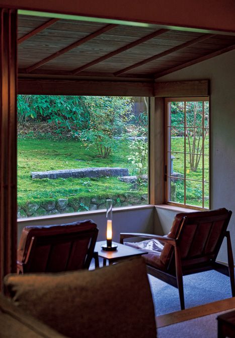 瑞々しい苔が広がる庭に向けて置かれた7番館のラウンジチェア。手前はリビングルームのソファ。どこに座っても、目が喜ぶ室内。