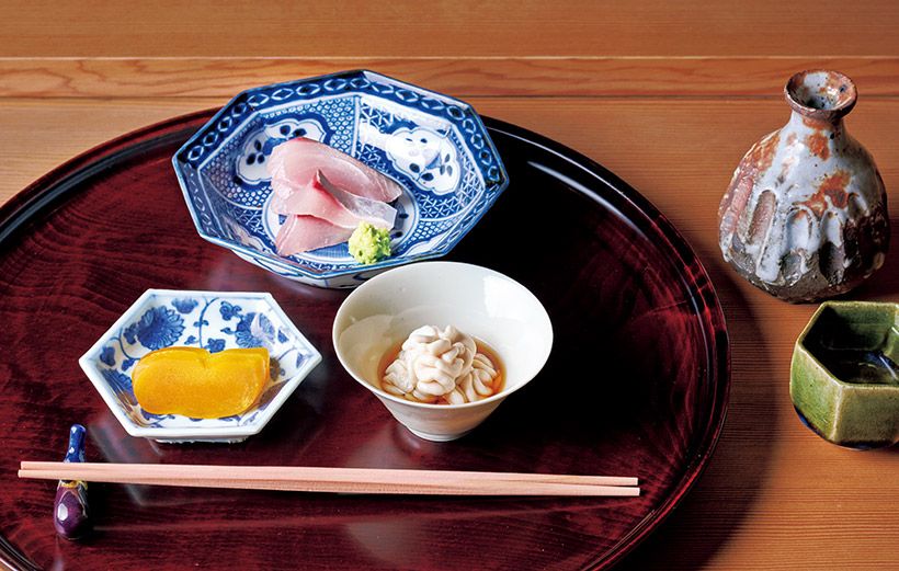 「十番館」の先付の一例。関さば刺し身、雲子、自家製からすみ。