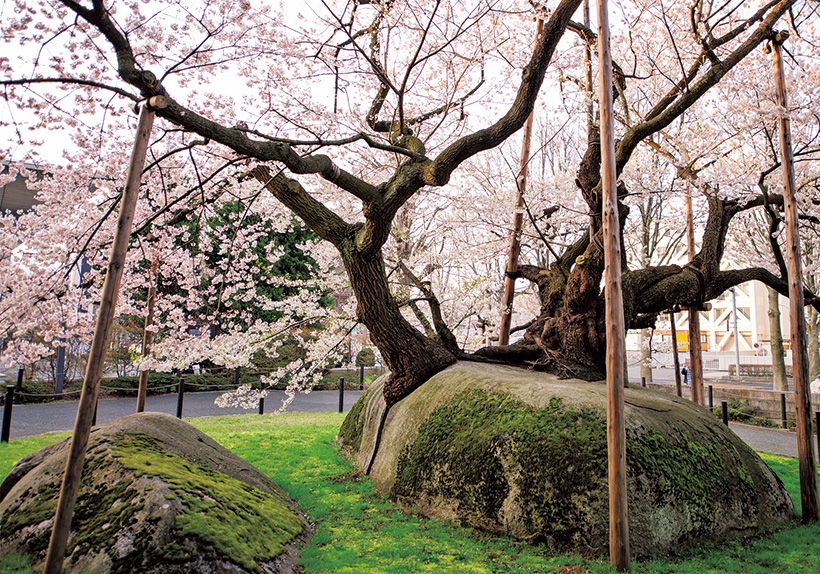 周囲約21メートルの巨大な花崗岩の狭い割れ目から突き出た樹齢350~400年の江戸彼岸。幹周囲4.6メートル、高さ10.6メートル、枝の張りが18.8メートルの大木で、桜では日本最北端の国の天然記念物。