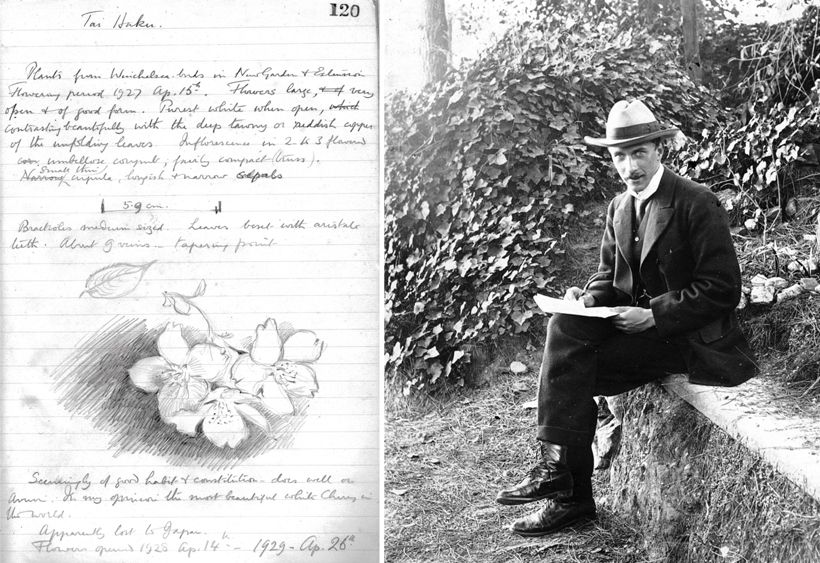 右・25歳の頃のイングラム。左・イングラムが第二次世界大戦中に書きためた桜の観察記録。描かれているのは太白。2点ともイングラム家所蔵、阿部菜穂子提供 参考文献/『チェリー・イングラム 日本の桜を救ったイギリス人』(阿部菜穂子著 岩波書店刊)