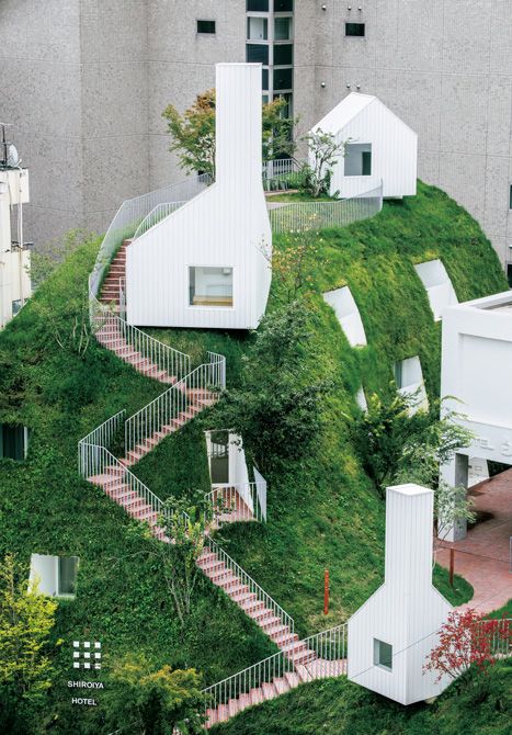 個室サウナや、アートが展示される複数の白い建物がグリーンの中に点在した外観そのものも、藤本壮介さん設計によるアートな雰囲気。©Katsumasa Tanaka